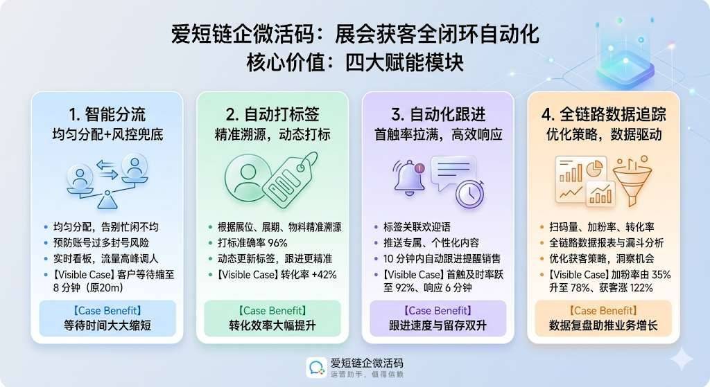 针对展会获客痛点,爱短链企微活码用“智能分流-自动打标-跟进提醒-数据复盘”全闭环,实现从扫码到转化的全流程自动化。