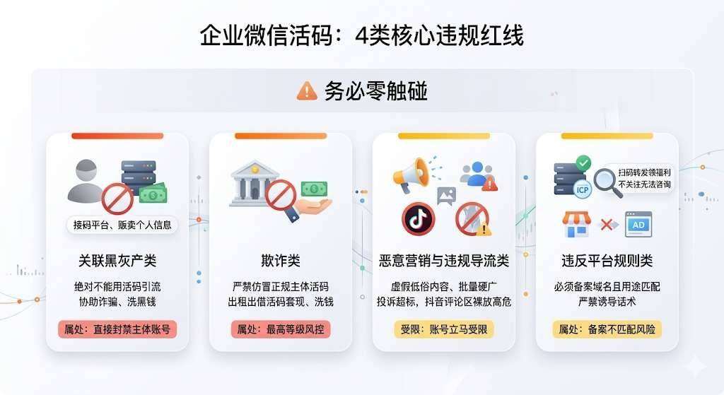 别心存侥幸,活码违规的后果远不止活码失效:轻则客户联系权限被封、主体账号降权,重则企业被打信用标记、全平台封禁。