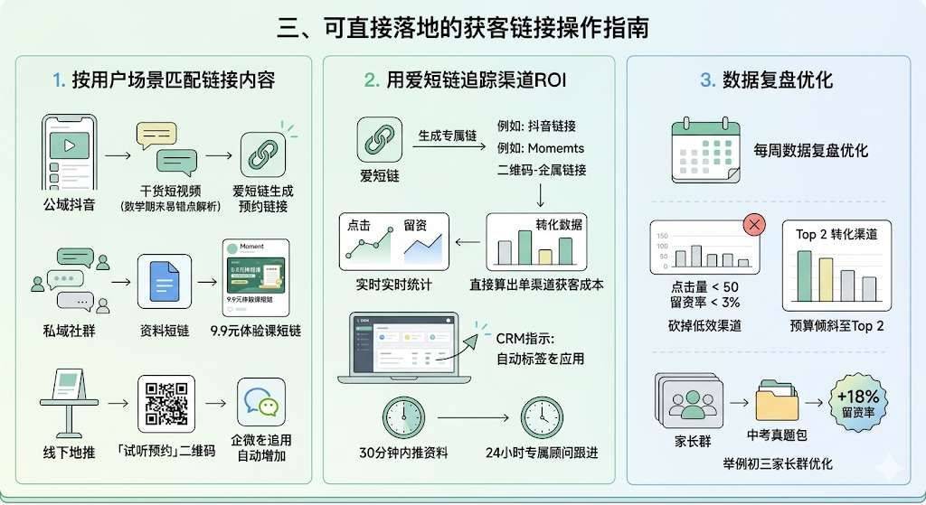 公域抖音先更新干货短视频(如「数学期末易错点解析」),引导私信领取爱短链生成的预约链接; 私域社群发资料短链、朋友圈发9.9元体验课短链; 线下地推放置爱短链生成的「试听预约」二维码,扫码自动添加企微。