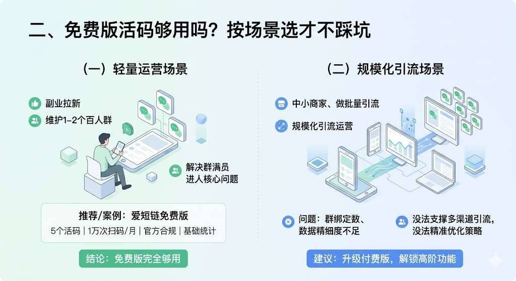 如果是副业拉新、仅维护1-2个百人群的个人,免费版完全够用,能解决群满员无法扫码进群的核心问题。 比如爱短链免费版支持5个活码、每月1万次扫码量,自带官方合规检测,还能查看基础扫码统计,完全覆盖日常需求。