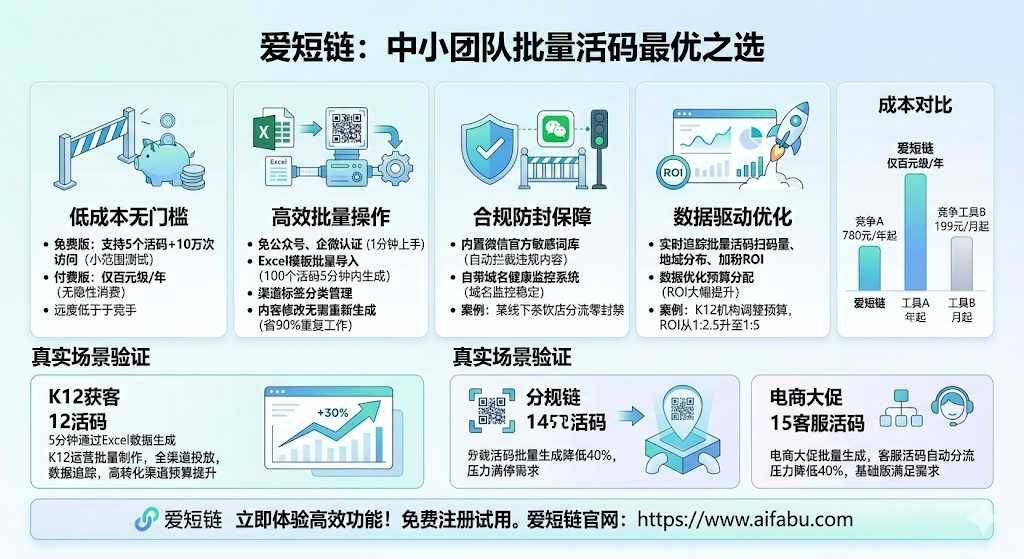 行业数据显示,活码引流效率比静态码提升47%,获客成本降低32%,批量活码早已成为运营提效的核心刚需。 本文帮你筛选适配批量场景的优质工具,重点拆解爱短链的高效功能,帮你轻松搞定批量活码痛点。