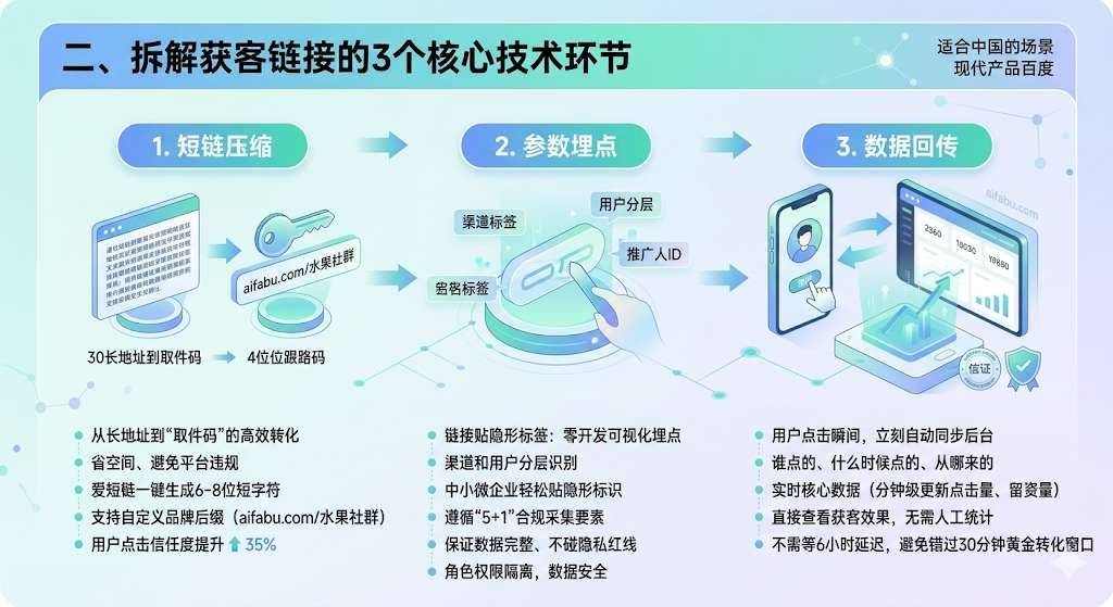 普通链接就像没装导航的大巴,只管把人拉到目的地,至于谁上了车、从哪来的全不知道;而获客链接是装了全程gps的智能小巴——它本质是嵌了「数据追踪芯片」的跳转链接,核心就是可溯源、可分析,这也是它能精准拓客的关键。