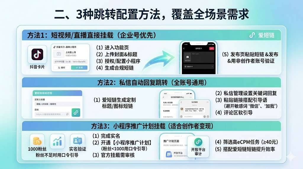 做抖音电商、本地生活的运营,是不是总卡在抖音导流量去小程序这步?要么设置半天跳不通,要么踩了违规红线白忙活? 本文讲透全场景跳转配置 避坑技巧,搭配爱短链(https://www.aifabu.com)精准追踪数据,高效盘活流量!